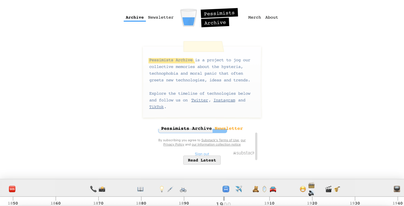 A screenshot of the timeline of invention from pessimistsarchive.org